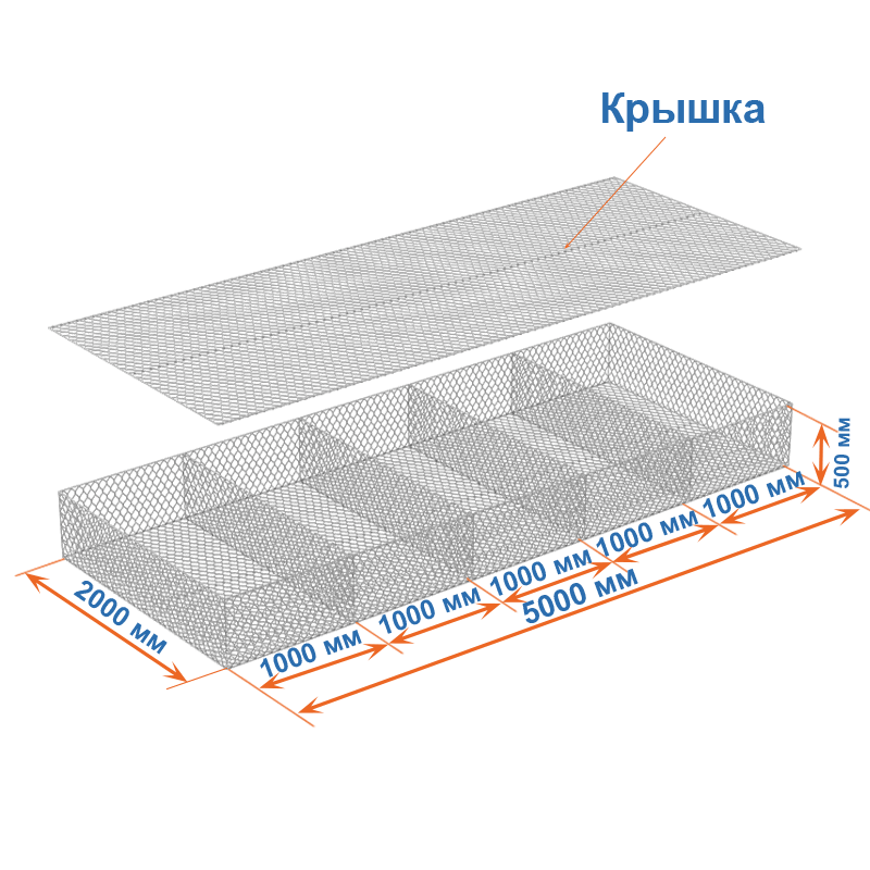 Габион матрац ГСИ-М 5х2х0,5 оцинкованный / ЦП, Ø проволоки 2,7/3,7 мм, размер ячейки 8х10 см