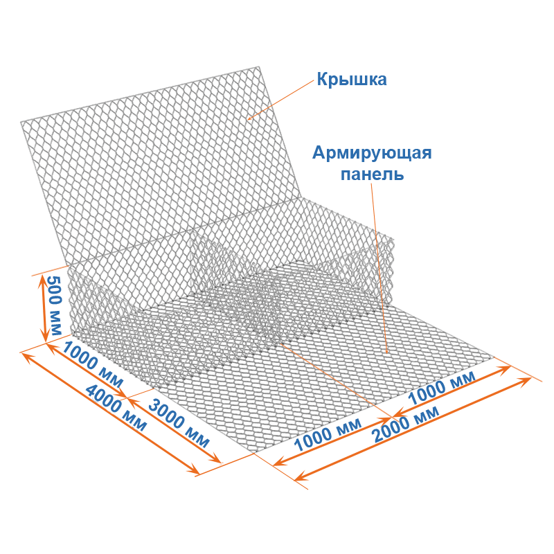 Габион с армирующей панелью 4x2x0,5 – это коробчатый габион, основание которого продлено и представляет собой армопанель.