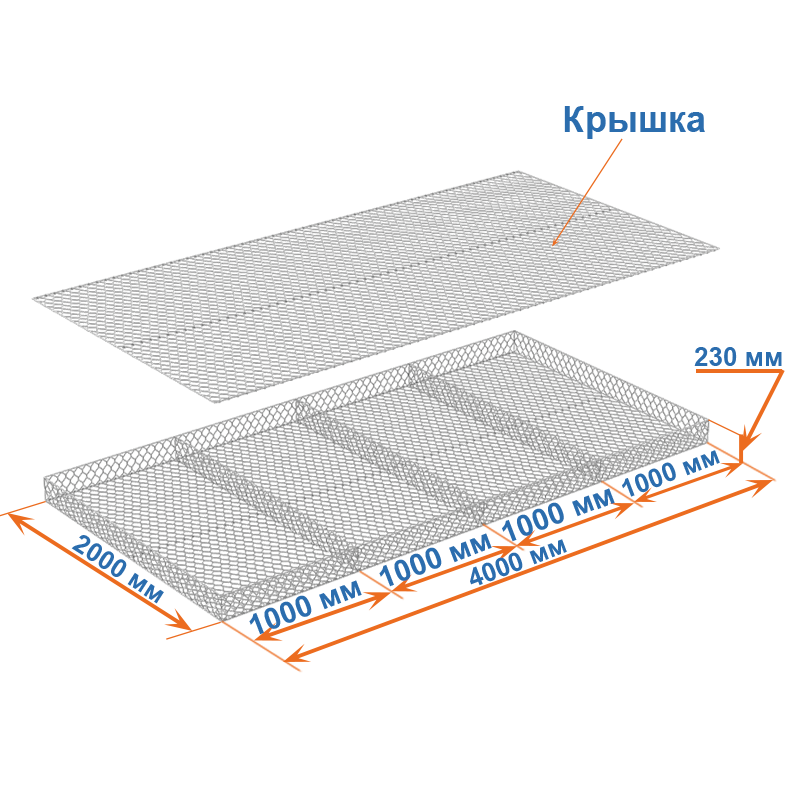 Габион матрац ГСИ-М 4х2х0,23 оцинкованный / ЦП, Ø проволоки 2,7/3,7 мм, размер ячейки 8х10 см